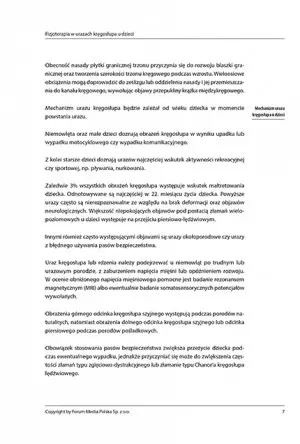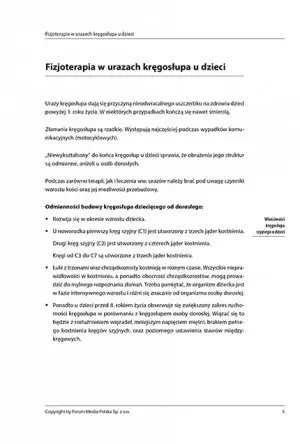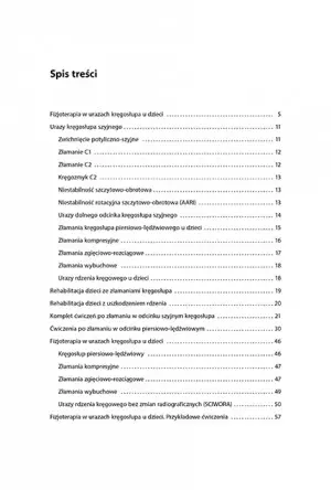 Dodatkowo w e-wydaniu scharakteryzowane zostały najpowszechniejsze urazy kręgosłupa u dzieci, ze złamaniami kręgosłupa i uszkodzeniami rdzenia włącznie. Opisy te obejmują też metody diagnostyczne i leczenia oraz cenne wskazówki odnośnie prawidłowych i błędnych czynności towarzyszących zajmowaniu się małymi pacjentami. E-wydanie zawiera też część praktyczną: 47 ilustrowanych i opisanych szczegółowo ćwiczeń, wraz z ogólnymi zasadami wykonywania ich oraz kompleksowym opisem procesu rehabilitacji. Publikacja posłuży zarówno fizjoterapeutom, jak i pacjentom indywidualnym.
