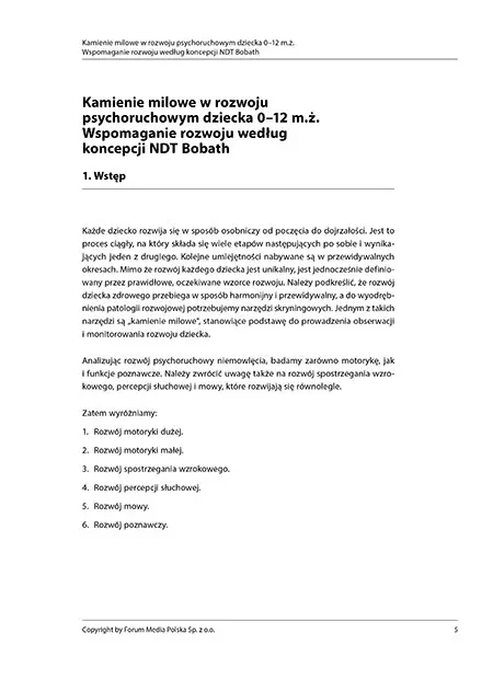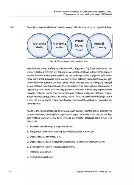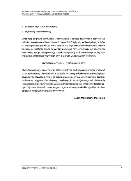 W pozycji pronacyjnej dziecko umie podnieść głowę i ramiona między 45–90° wraz z symetrią i alignmentem. Alignment (liniowość) oznacza zdolność utrzymania głowy wzdłuż głównej linii tułowia (oś środkowa ciała), stanowiąc jego przedłużenie, jednakową długość boków tułowia, a także zdolność do utrzymania liniowej pozycji jednego stawu względem drugiego stawu. Dziecko potrafi podeprzeć się na stawach łokciowych i wykonać podpór, utrzymując stabilnie kontrolę głowy i wodząc wzrokiem w promieniu 180° za przedmiotem. Oba ramiona są w równej odległości od uszu, a stawy łokciowe ustawione są w linii prostej pod stawami barkowymi (zdj. nr 9). Niemowlak nie potrafi jeszcze wysuwać rąk w przód, ponieważ nie opanował zdolności przeniesienia ciężaru ciała na boki ani też naprzemiennego wydłużania/ skracania stron ciała. Potrafi natomiast połączyć swobodnie obie dłonie, badać zabawkę dłońmi i ustami, w linii środkowej ciała. Dla wielu dzieci ruch uniesienia głowy do góry jest bardzo trudny. W szczególności dla dzieci z obniżonym napięciem mięśniowym. Można wówczas posiłkować się zabawką świecącą i wydającą dźwięki. Są to bodźce bardzo motywujące.