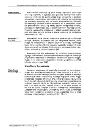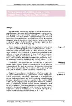 Leczenie zachowawcze stosowane jest głównie w przypadkach objawowej kręgoszczeliny lub kręgozmyku o małym stopniu ześlizgu (do 25%) [8]. W postępowaniu zachowawczym, obok prowadzonej rehabilitacji, zaleca się: ograniczenie czynności i ruchów prowadzących do powstawania zbyt dużych naprężeń w okolicy lędźwiowo-krzyżowej kręgosłupa, stosowanie zaopatrzenia ortopedycznego (17] oraz okresowe badania obrazowe i kontrolę lekarską w celu wykluczenia progresji ześlizgu [24]. U dzieci i nastolatków kontrole powinny się odbywać co 6-12 miesięcy, aż do osiągnięcia dojrzałości kostnej (IV-V stopień wg skali Rissera). U dziewcząt około 2 lata po wystąpieniu menarche [24]. Badania prowadzone przez klein i wsp. [25] dotyczące badań skuteczności leczenia zachowawczego wskazują na bardzo dobre wyniki funkcjonalne u 84% pacjentów. Głównymi czynnikami decydującymi o sukcesie są wiek oraz stopień uszkodzeń struktur w chwili rozpoczęcia leczenia (11, 24, 25).