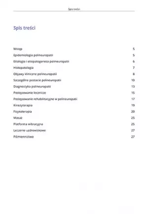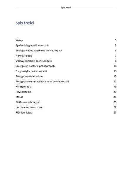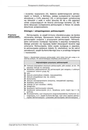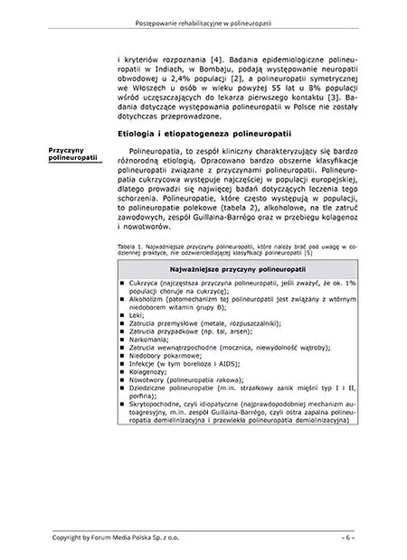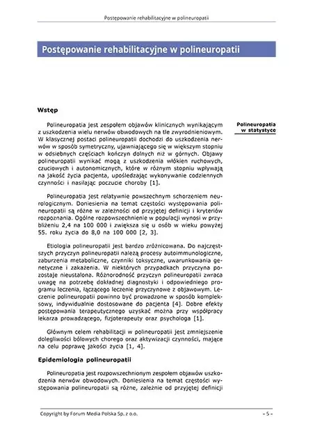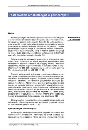 Postępowanie rehabilitacyjne u chorych z polineuropatią powinno być procesem zapoczątkowanym jak najwcześniej, ciągłym, skoordynowanym i nadzorowanym oraz dobranym indywidualnie do pacjenta [7]. Ze względu na ciągły brak skutecznej farmakoterapii w polineuropatii poszukuje się różnych innych metod leczniczych, redukujących dolegliwości bólowe i zmniejszających inne objawy. Stosuje się różne zabiegi z działu fizykoterapii: masaże, akupunkturę, wolnozmienne pole magnetyczne, przezskórną stymulację elektryczną oraz kinezyterapię. Brak jest jednak dużych kontrolowanych badań metod fizykalnych, w których udowodniono by skuteczność przeciwbólową zabiegów z zakresu fizykoterapii [7]. Rehabilitacja ma charakter kompleksowy, a jej program usta- lany jest indywidualnie do każdego pacjenta w zależności od rodzaju polineuropatii, okresu choroby, wielkości zaburzeń, stanu pacjenta w trakcie rehabilitacji i chorób towarzyszących. W do- borze ćwiczeń warto kierować się indywidualnymi upodobaniami, wiekiem, kondycją i możliwościami chorego, stosując odpowiednią motywację [31]. W całym procesie usprawniania, na uwagę zasługuje zaanga- żowanie i edukacja chorego, a także jego rodziny, które mają ogromny wpływ na rezultaty osiągane przez pacjenta i jego dalszą motywację do systematyczności w wykonywaniu ćwiczeń. Terapeu- ta powinien odpowiednio objaśnić choremu sposób wykonywania każdego ćwiczenia oraz cel ćwiczenia, aby pacjent uczestniczył w usprawnianiu w sposób w pełni świadomy [1]. W skład programu rehabilitacji wchodzi również terapia zajęciowa. Chory może w trakcie zajęć funkcjonalnie wykorzystywać zdobyte umiejętności [1, 32].