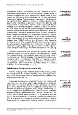 Przed rekonstrukcją ACL należy usunąć ograniczenia ruchu kolana, zanik mięśni, zaburzenia chodu, wysięk i ból stawów. Większość pacjentów poddawanych ACLR to sportowcy w wieku około 25 lat. Głównym celem ACLR jest ustabilizowanie kolana, aby zapobiec powtórnym urazom i umożliwić bezpieczny powrót do poprzednich poziomów sportu (18]. Po rekonstrukcji ACL głównymi celami rehabilitacji jest zapobieganie powikłaniom pooperacyjnym, a ostatecznie osiągnięcie prawidłowej funkcji kolana. Istnieje wiele czynników wpływających na powrót do zdrowia po rekonstrukcji ACL (tab. 6). Aby osiągnąć pożądane cele, pacjenci po ACLR muszą odzyskać pełny ruch kolana, prawidłową mechanikę chodu, odpowiednią siłę mięśni kończyn dolnych, normalną ruchomość rzepki, koordynację oraz propriocepcję i funkcję nerwowo-mięśniową. Program rehabilitacji obejmuje otwarte i zamknięte ćwiczenia łańcucha kinetycznego, aby wzmocnić mięśnie i kondycję sercowo-naczyniową, oraz techniki treningu nerwowo-mięśniowego. Ponadto program rehabilitacji musi zostać zaprojektowany w oparciu o cele zawodowe pacjenta, urazy współistniejące, rodzaj zastosowanego przeszczepu i gojenie pooperacyjne (18].