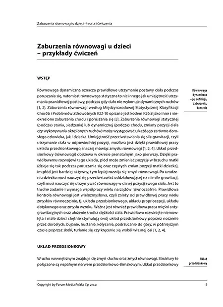 Dzięki elektronicznemu formatowi, zawarte w tym ebooku materiały można bez problemu przenosić i wyświetlać na ekranach różnej wielkości. Publikacja stanowi cenną pomoc w procesie fizjoterapii dzieci z zaburzeniami równowagi.